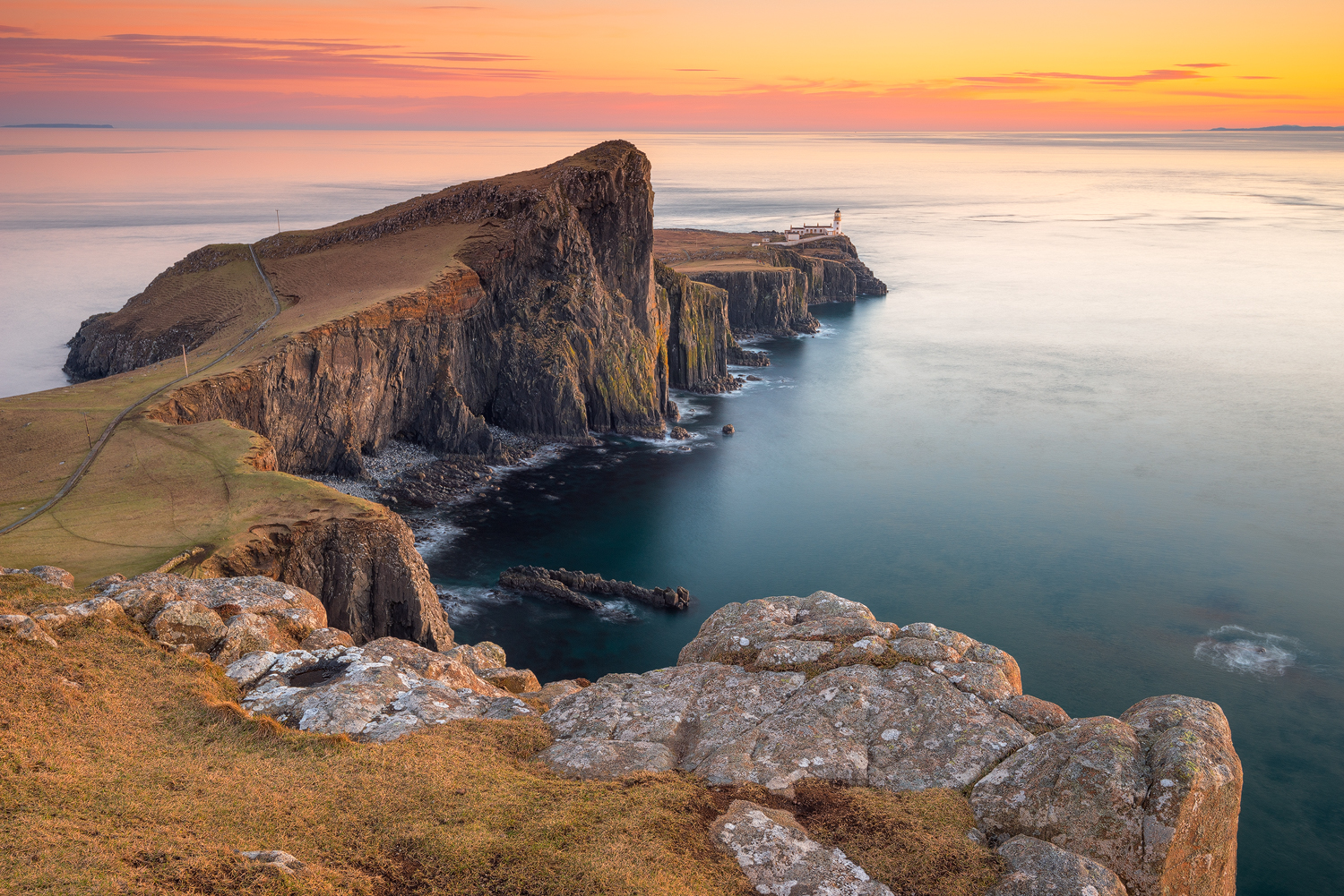 Spesso passeggiando per queste terre mi sono sentito solo, ero piccola cosa rispetto all’immensità di quella dimensione percettiva fatta di torri di basalto scuro che si innalzavano prepotentemente tra le fenditure della terra, un mare violento davanti a sbarrarmi la strada e dietro di me soltanto taglienti muri di roccia. L’isola ha dettato da subito le sue regole facendomi capire che è Lei a decidere se e quando lasciarsi ritrarre. Stante questa sua iniziale ostilità ha saputo poi regalarmi colori tanto graditi quanto inattesi, i venti che solitamente squassano i suoi boschi di abete e betulla o che nei secoli hanno pazientemente scolpito montagne erodendone i profili possono repentinamente aprire varchi tra immensi cumulonembi oppure ricamare in pochi secondi dei cirri molto complessi. E’ una terra imprevedibile, avrei dovuto capirlo anche in quell’attimo così emotivo in cui ho visto balenare luci aliene in alto nel cielo dietro il faro di Neist Point, quando una scia di colori verdi ha tessuto trame con le stelle… l’aurora boreale.